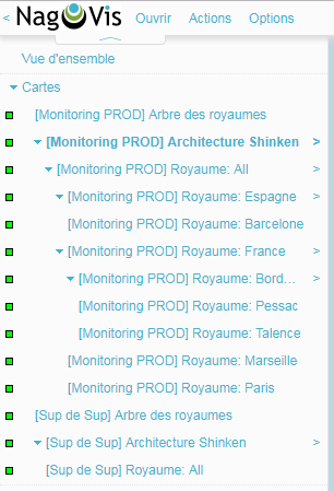 Le résultat des ces opérations est la présence de cartes et d'hôtes permettant de visualiser l'architecture de la plateforme secondaire (Sup de Sup) et de la plateforme principale (Monitoring PROD):
