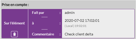 Comme pour l'action prise en compte, s'il y a un décalage horaire entre l'heure du navigateur et l'heure du serveur utilisé par le démon Broker, l'heure affichée sera en priorité celle du serveur. Un second affichage apparaîtra pour indiquer la correspondance avec l'heure locale ( affichée en gris ).