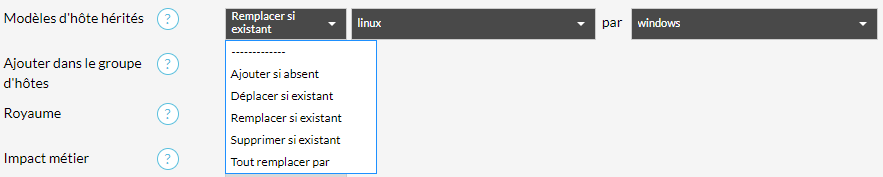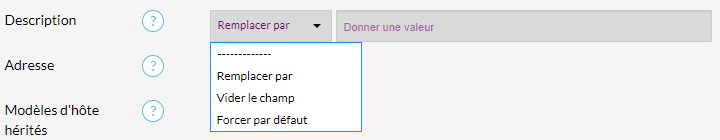 | Modifier seulement si la valeur est définie sur "type" | La donnée ne sera modifiée que si l'élément a une définition effective sur l'élément (si la valeur par défaut est présente, le changement sera ignoré). Dans l'exemple, la valeur sera modifiée que si elle a été définie sur l'hôte. |