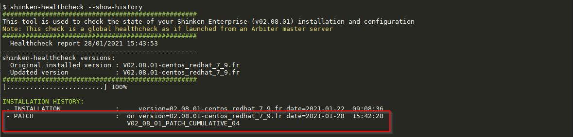Afin de voir si des patchs sont déjà installés, il faut utiliser l'option "--show-history" du Shinken-healthcheck :