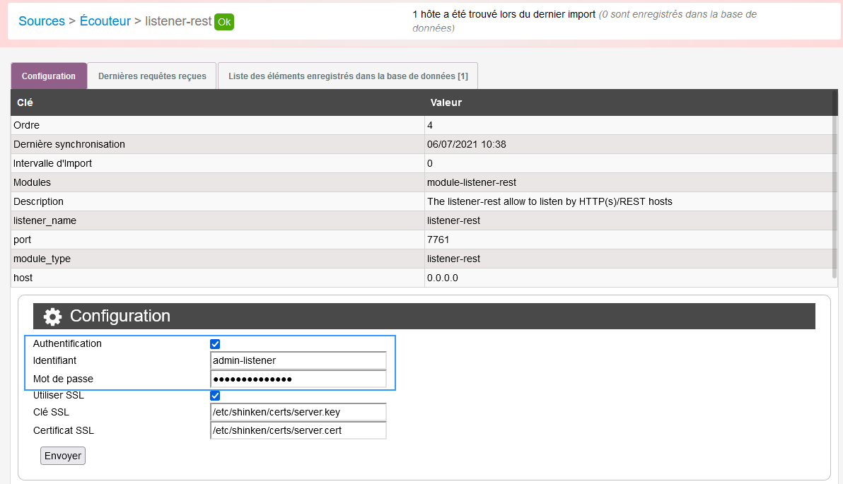 Il est possible d'authentifier les requêtes grâce à un couple identifiant/mot de passe, configurable uniquement sur la page de l'écouteur, dans l'onglet Configuration.