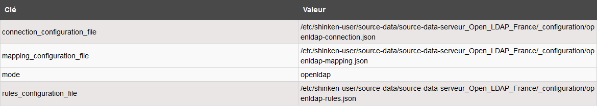 Le mapping des informations collectées par la source se configure dans le fichier indiqué par le paramètre mapping_configuration_file ( voir la page Le mapping des informations collectées des champs du serveur Open LDAP vers les propriétés et les données Shinken ).