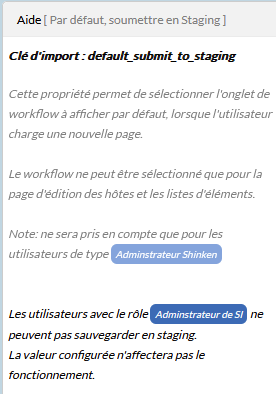 Exemple avec la propriété "Par défaut, soumettre en Staging" sur un utilisateur dont le rôle est "Administrateur de SI" :