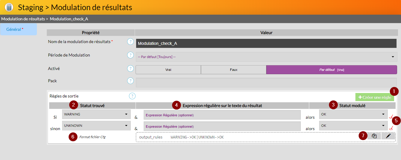 Vous pouvez préciser dans la colonne "Expression régulière sur la sortie" un texte qui sera comparé avec le texte de sortie du résultat. Si le texte est trouvé sur la sortie du résultat et que le statut d'élément est le même que celui choisi dans la colonne "Statut trouvé" alors la modulation de résultat sera appliquée. ( 4 )