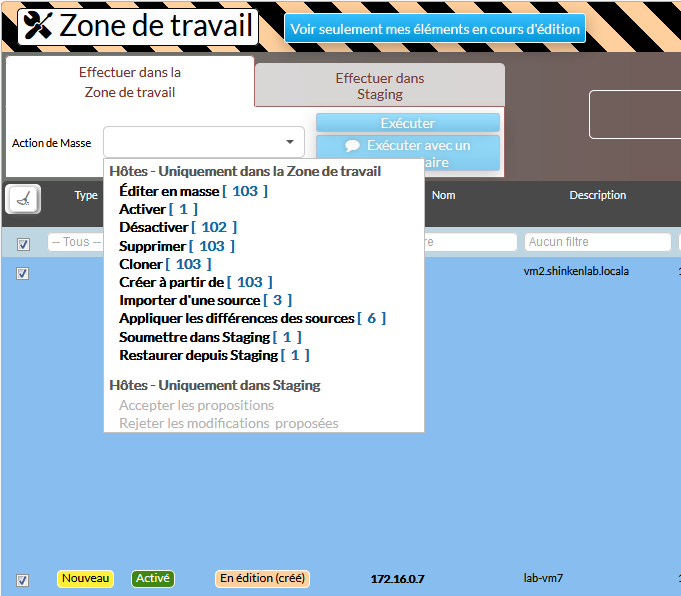 - Il est important de noter que les actions de masses disponibles peuvent être différentes entre la Zone de Travail et Staging.