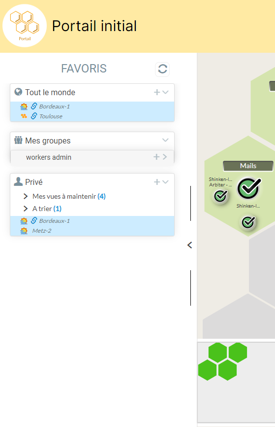 Les favoris est une partie de l'interface de Visualisation qui permet d'avoir des rangements de vues pour soi ( section "Privé" ), pour un groupe ( section "Mes groupes" ) où pour tout le monde ( section "Tout le monde" ).