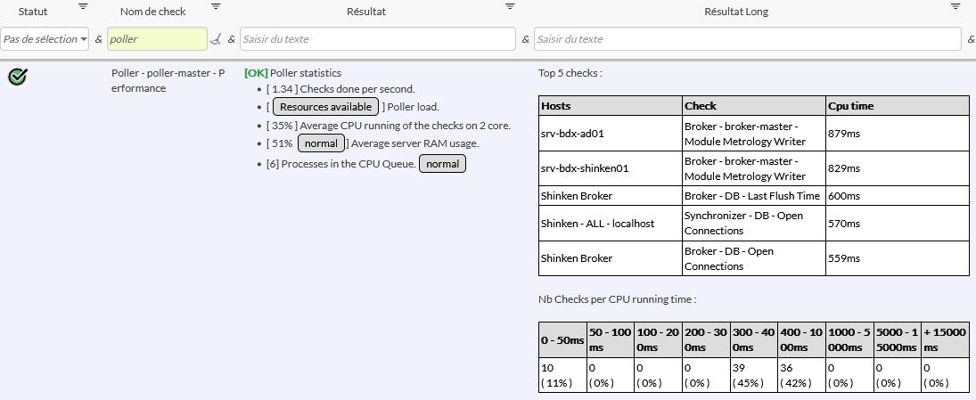 Le check "Poller - Performance", qui permet de superviser le bon fonctionnement de Shinken, possède un Résultat et un Résultat Long.