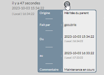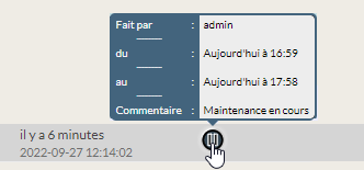 Pour afficher les informations d'une période de maintenance active, il faut à l'aide de la souris survoler le contexte pour afficher l'info bulle contenant le nom de l'auteur, la date de début, la date de fin et le commentaire.