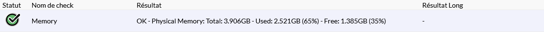 - La consommation de mémoire par le système au moment de la vérification, détaillant la quantité totale disponible, la quantité et le pourcentage d'utilisation, la quantité et le pourcentage de mémoire libre.