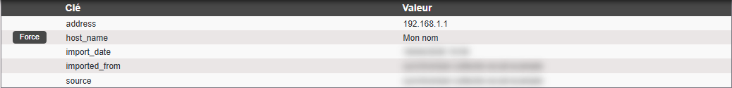 Il est possible d’ajouter le suffixe [FORCE] ( sans espace ) à la clé d’import d'un élément Shinken afin de forcer la valeur associée (voir la page Forcer la valeur des noms des éléments et des propriétés de type liste (comme la propriété des modèles hérités)).