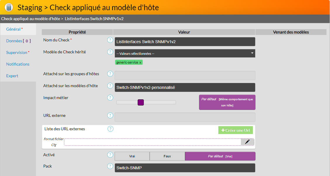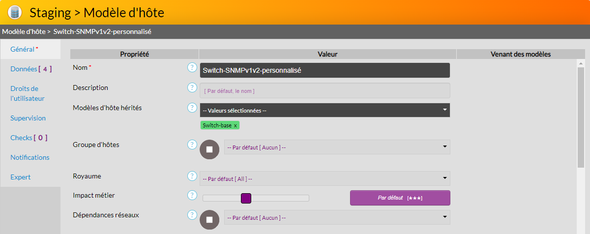 Dans notre exemple, nous n'utilisons que le modèle Switch-base, mais dans d'autres cas, il pourrait être utile d'utiliser les autres modèles fournis par le pack ( Switch-SNMPv1v2, Switch-SNMPv1v2-detailed ).