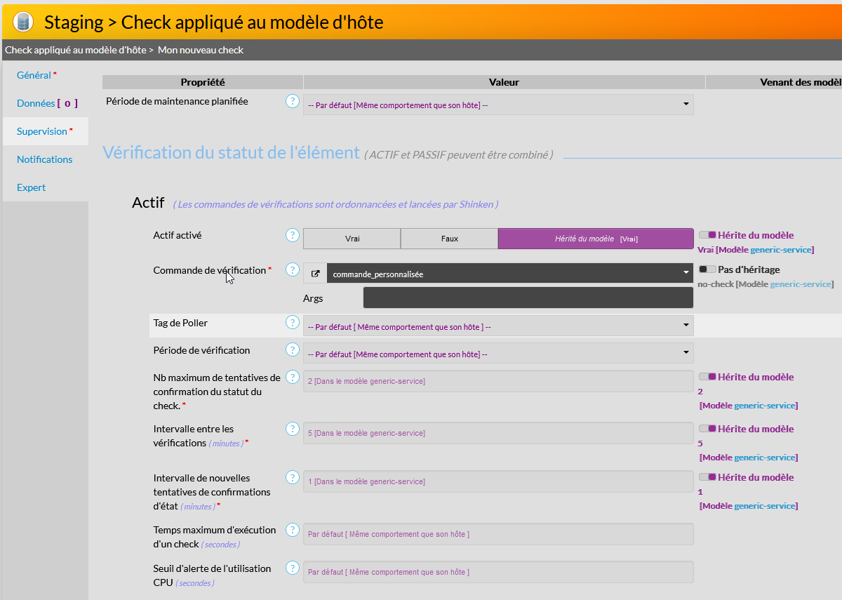 Pour rappel, le modèle "generic-service" défini les champs obligatoires à la validité du check ( Commande de vérification, Nombre maximum de tentatives de confirmation du statut du check, Intervalle entre les vérifications, Intervalle des nouvelles tentatives de confirmations d'état ) - Définir le nom du modèle sur lequel le check sera rattaché ( propriété : Attaché sur les modèles d'hôte ).