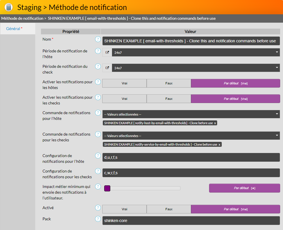 La méthode de notification "SHINKEN EXAMPLE [ email-with-thresholds ] - Clone this and notification commands before use" permet d'envoyer un mail de notification à l'utilisateur à notifier.