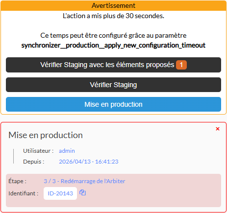Lorsqu'une vérification de la configuration ou qu'une mise en production dure trop longtemps, la page de Production considère l'Arbiter comme indisponible ( timeout ).