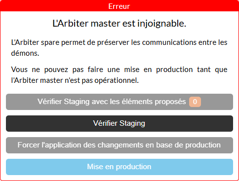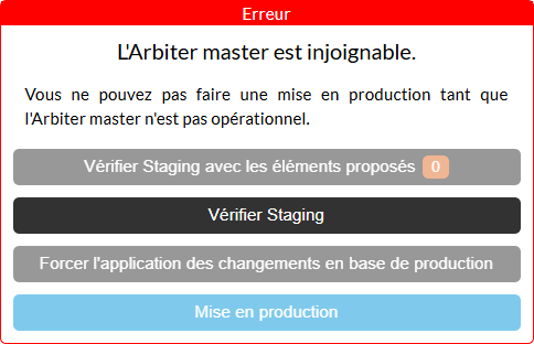 Si l'Arbiter n'est pas joignable, le bouton "Mise en production" est désactivé.