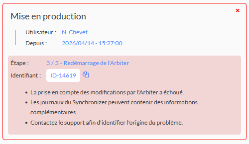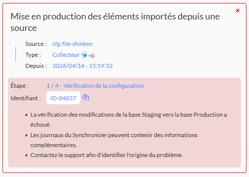 Des erreurs peuvent survenir durant chaque étape de chaque action, indépendamment de la page de production. L'origine d'une erreur ne pouvant être déterminée depuis la page de production, il faut consulter le fichier de log du Synchronizer ( voir la page Les logs du Synchronizer ) afin de connaître l'origine exacte du problème.