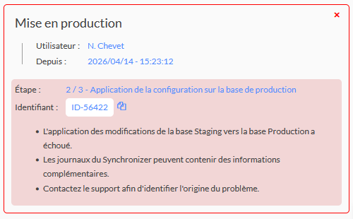 Erreur durant l'étape d' "Application de la configuration sur la base de production"