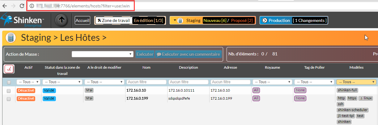 Enfin, il est également possible de filtrer par le biais de plusieurs filtres via URL, filtrons par exemple les hôtes activés, contenant les caractères LAB dans leurs noms et qui ne contiennent pas windows dans leurs modèles :