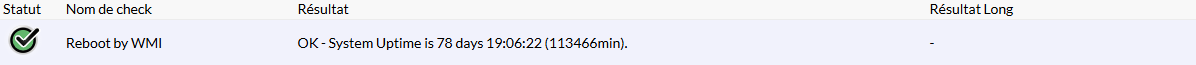 WINDOWS_REBOOT_WARN | l'Hôte ( Onglet Données ) | minute | 15 | 15 | Temps en dessous duquel le check passe en avertissement. |