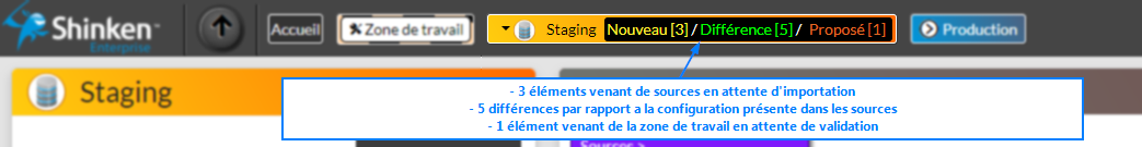 Cette barre indique le nombre d'éléments qui diffèrent entre les données présentes dans l'espace de Staging et l'espace de Production.