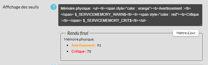 - Les données seront interprétées dans le "Rendu final" pour avoir la dynamique de configuration des seuils. ( voir la page Les Variables ( Remplacement dynamique de contenu - Anciennement les Macros ) )