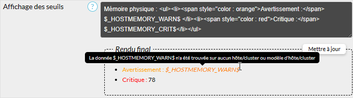 - Les données seront interprétées dans le "Rendu final" pour avoir la dynamique de configuration des seuils. ( voir la page Les Variables ( Remplacement dynamique de contenu - Anciennement les Macros ) )