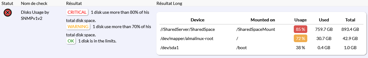 Le résultat contient le statut du check, ainsi que le nombre de disques dépassant les seuils.