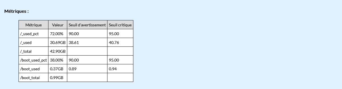 | ( nom_du_point_de_montage )_used_pct | % | Pourcentage d'occupation du disque | -- | -- |