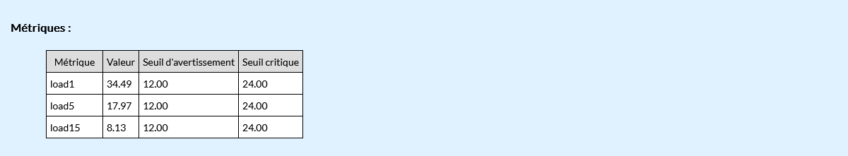 | load15 | -- | Moyenne de la charge pendant les 15 dernières minutes. | LINUX-BY-SNMP__LOAD-AVERAGE__LOAD-WARN * nombre_cpu | LINUX-BY-SNMP__LOAD-AVERAGE__LOAD-CRIT * nombre_cpu |