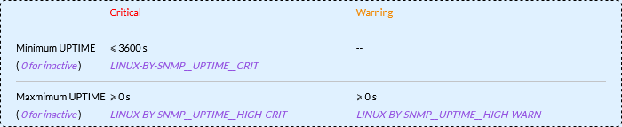 • Le serveur n'a pas été redémarré depuis plus que la valeur de LINUX-BY-SNMP__UPTIME__HIGH-CRIT secondes.