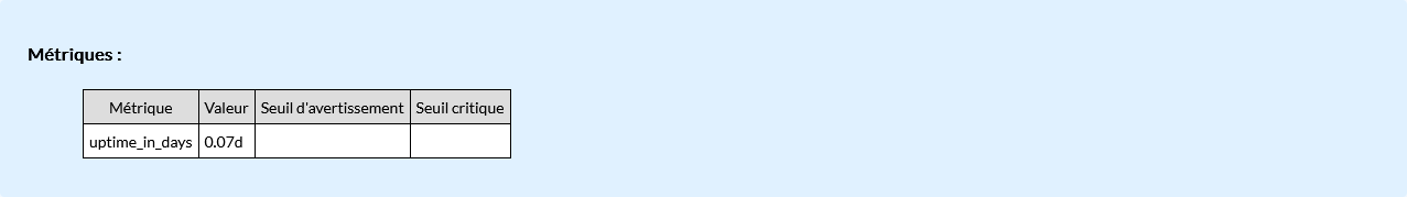 Nom de la métriqueUnitéDescriptionSeuil d'avertissementSeuil critique