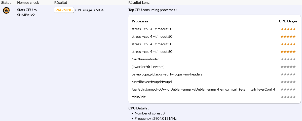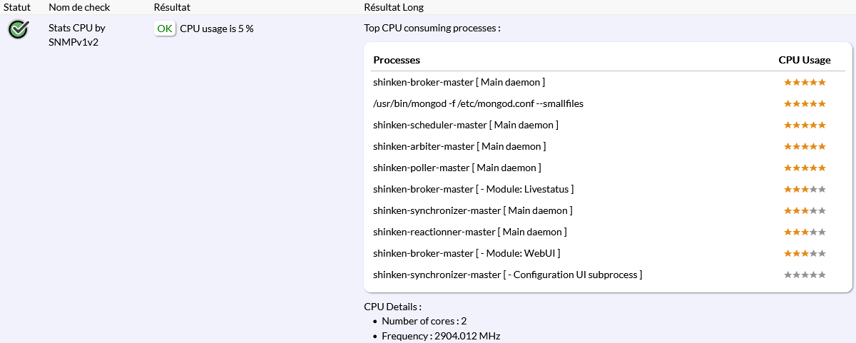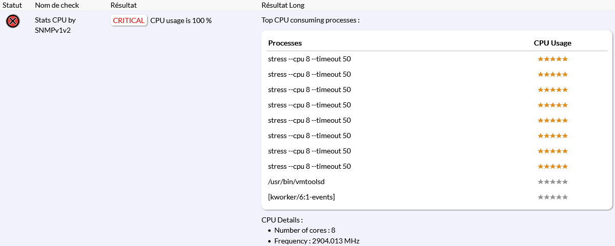 Le check Stats CPU by SNMPv1v2 va utiliser des commandes à travers votre serveur SNMP pour rechercher des informations sur votre CPU, tel que le nombre de cœurs, la fréquence, le pourcentage d'utilisation du processeur au cours de la dernière seconde et pour finir, si votre utilisation du processeur est trop importante, les X processus consommant le plus de CPU ( X étant la donnée CPU_MAX_PROCESS modifiable dans la configuration ) avec une notation "étoile" permettant de voir quels processus sont les plus consommateurs.