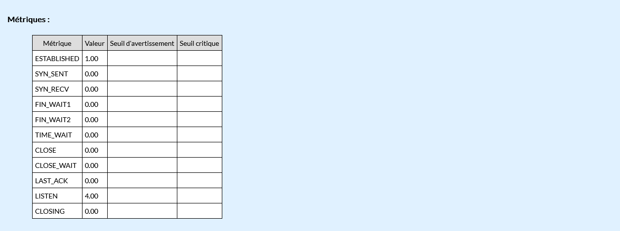 Le check Stats TCP by SNMPv1v2 va récupérer les états de vos ports TCP pour vous les renvoyer sous forme de métriques visibles dans l'interface de visualisation.