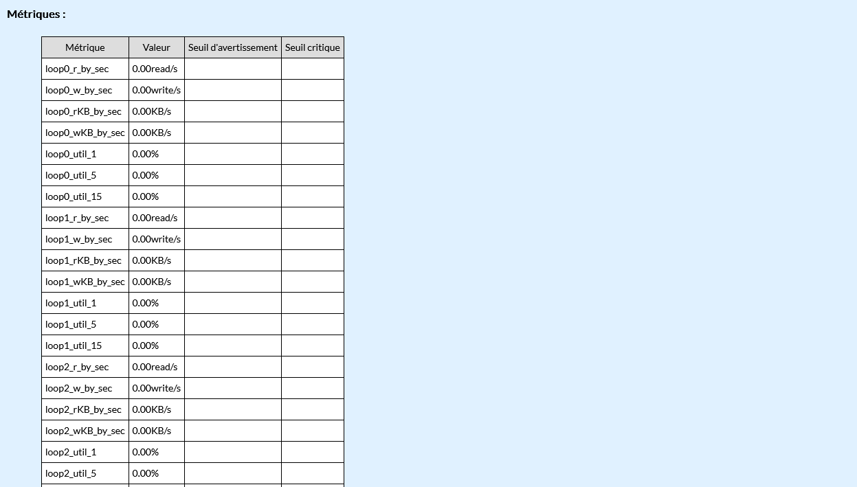 Nom de la métriqueUnitéDescriptionSeuil d'avertissementSeuil critique