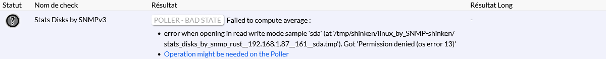 Le poller qui exécutera les checks nécessite un droit d'écriture et de lecture dans le répertoire décrit par LINUX-BY-SNMP__WORKING-FOLDER-BASE-PATH/LINUX-BY-SNMP__WORKING-FOLDER-TMP-DIRNAME, par défaut /tmp/shinken .