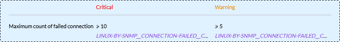 LINUX-BY-SNMP__CONNECTION-FAILED__CONNECTION-WARN | l'Hôte ( Onglet Données ) | - | 5 | Définit le nombre de connexions échouées à partir duquel le check passe en ATTENTION. |