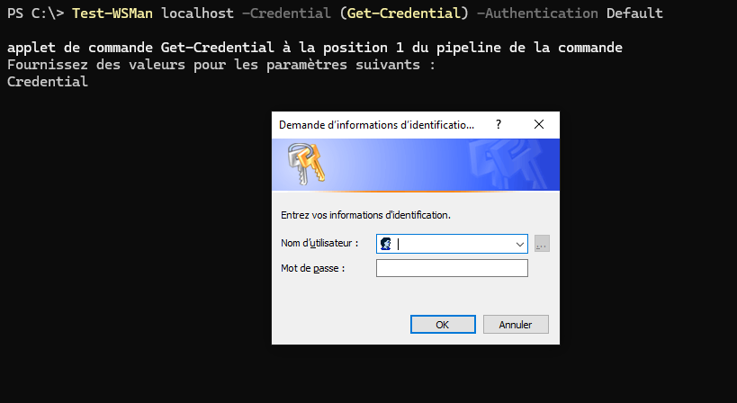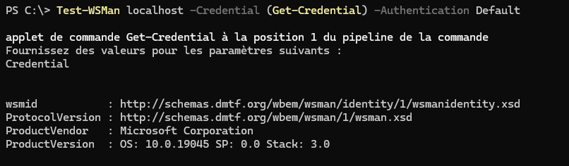 Test-WSMan localhost -Credential (Get-Credential) -Authentication Default
