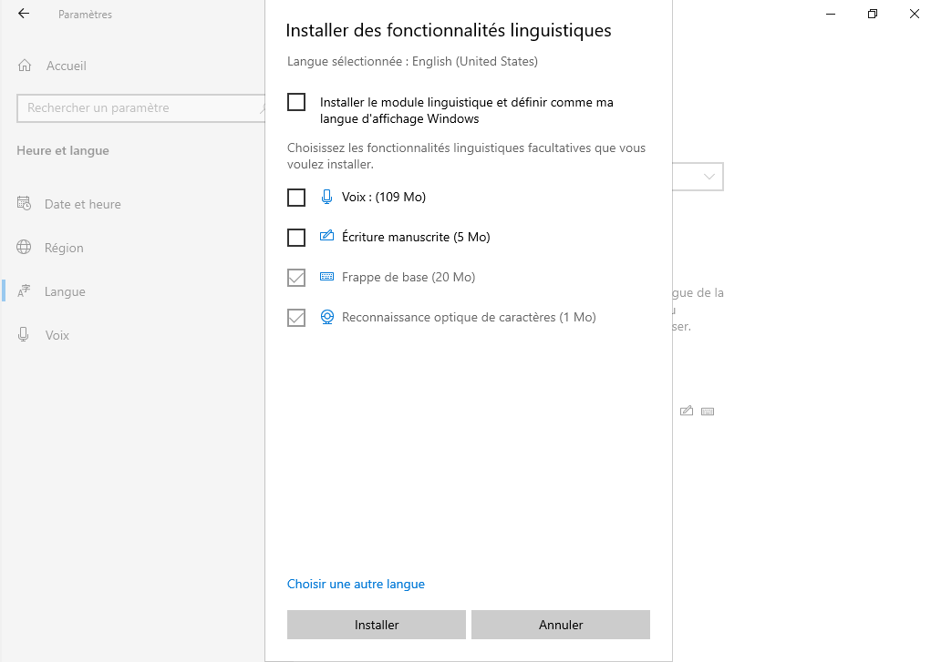 Pour d’autres versions de Windows, l’installation des langues devra être fait manuellement.