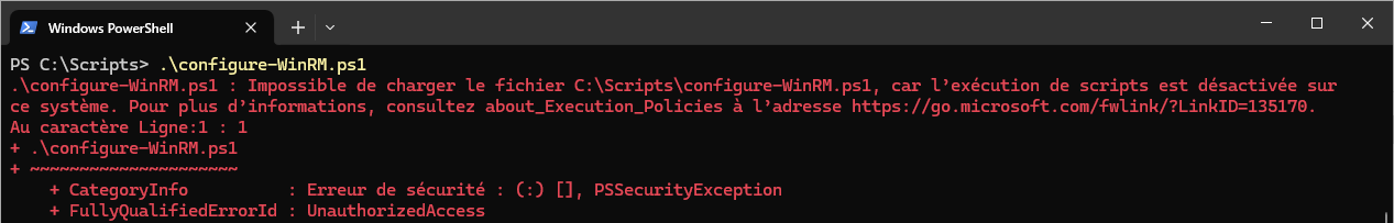Il est possible que vous obteniez l'erreur suivante. Par défaut, PowerShell peut empêcher l’exécution de scripts pour des raisons de sécurité. Cette restriction est contrôlée par votre stratégie d'exécution ( Execution Policy ) .