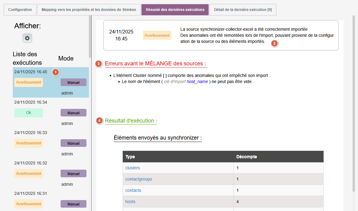 Lorsqu’un import d'un collecteur est effectué ou bien qu’une exécution d'un écouteur ou d'un analyseur est lancée, son rapport est stocké dans l'onglet "résumé des dernières exécutions", permettant d’avoir un récapitulatif détaillé.