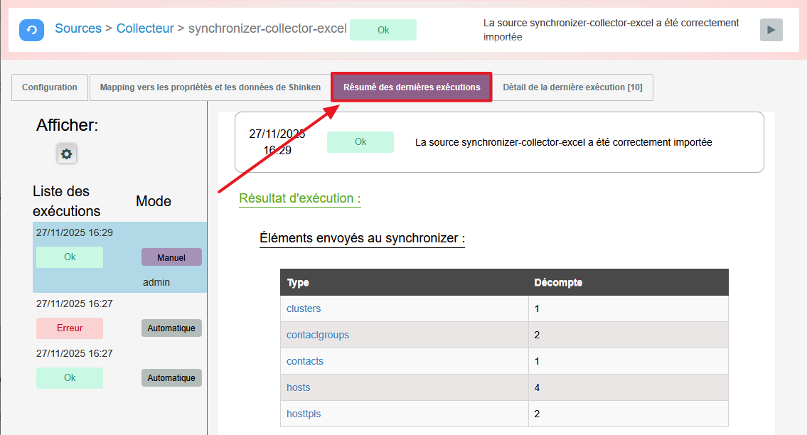 Cette page décrit et explique les informations qui apparaissent dans l'onglet "Résumé des dernières exécutions" de l'interface de la source.