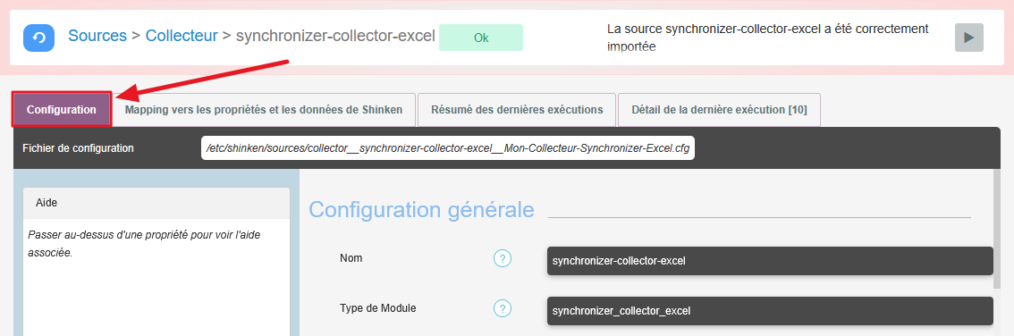 La configuration du collecteur, définie dans le fichier de configuration de la source ( voir la page Collecteur de type synchronizer_collector_excel ( Pour importer un fichier Excel ) ) peut être consultée dans l'onglet "Configuration", dont les différentes parties sont décrites ci-dessous.