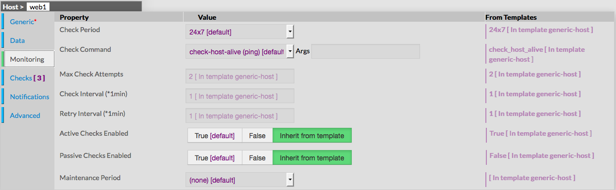 This form is used to configure properties that define monitoring for the host itself. Monitoring is defined by the following properties : - Check Period