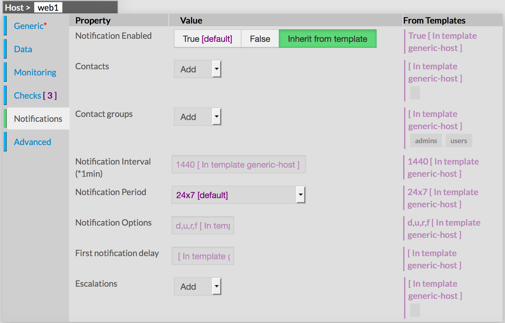 Host creation form will be displayed. This form is composed of tabs, corresponding to categories of properties : Generic Data Monitoring Checks Notifications Advanced
