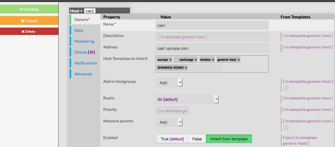 The form displayed is the same as the form used to create a new Host. All fields are filled with Host properties. Once changes have been made, configuration of the Host must be saved by clicking the Validate button available on the left menu. Cancel button revert all changes to precedent configuration. |  |