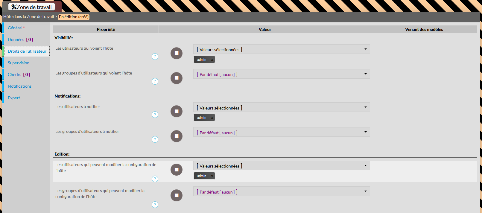 Il est possible pour chaque hôte, de définir qui peut voir, éditer, ou encore recevoir les notifications. Le fonctionnement de ce mécanisme est expliqué dans la page Droits d'accès à un hôte. Ces propriétés gèrent l'Héritage additif (le +).