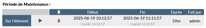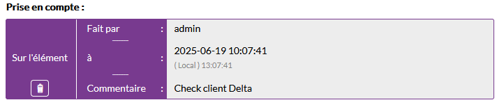 Comme pour l'action prise en compte, s'il y a un décalage horaire entre l'heure du navigateur et l'heure du serveur utilisé par le démon Broker, l'heure affichée sera en priorité celle du serveur. Un second affichage apparaîtra pour indiquer la correspondance avec l'heure locale ( affichée en gris ). |