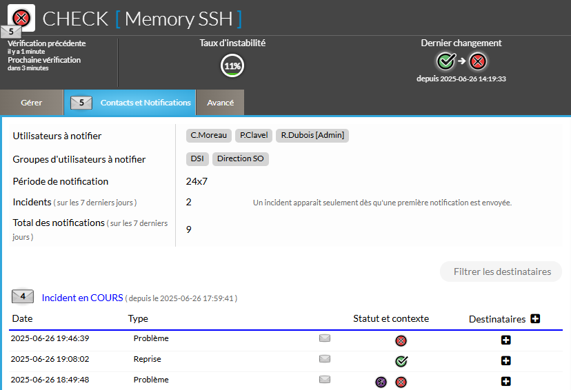 Si un incident est "EN COURS" sur ce check ( voir la page Les incidents ) :