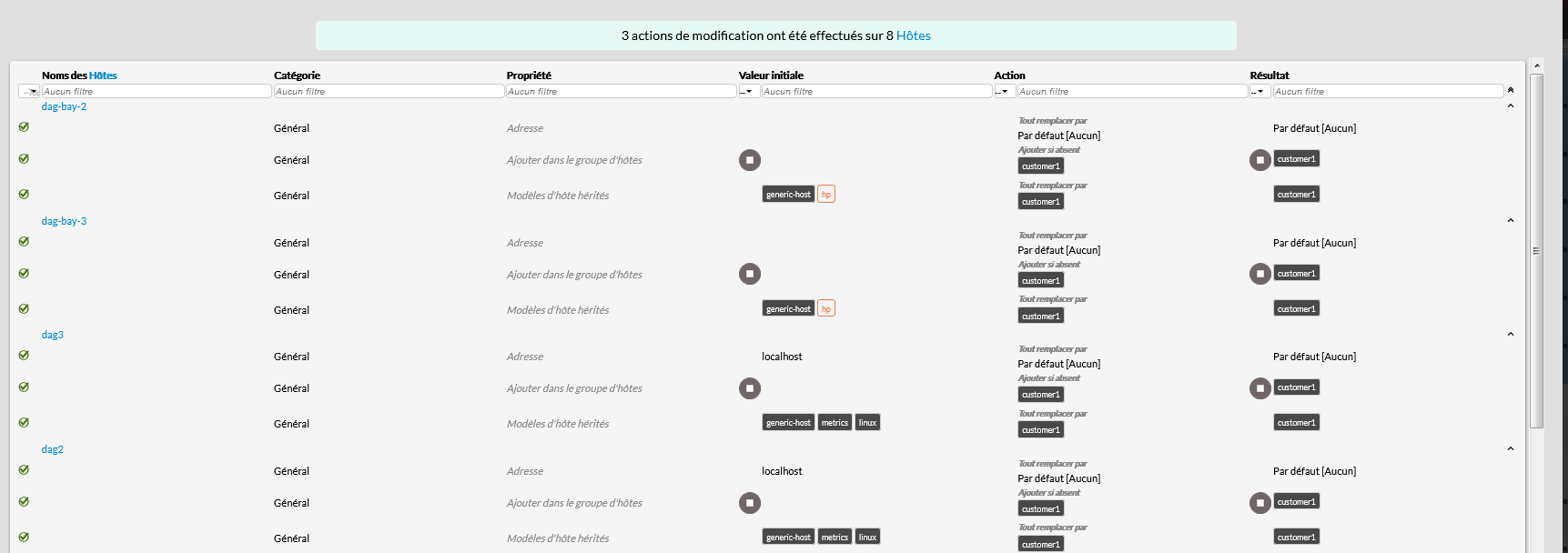 Pour chaque élément (hôte ou modèle d'hôte) faisant l'objet d'une modification en masse, tous les checks attachés sont affichés dans une liste.