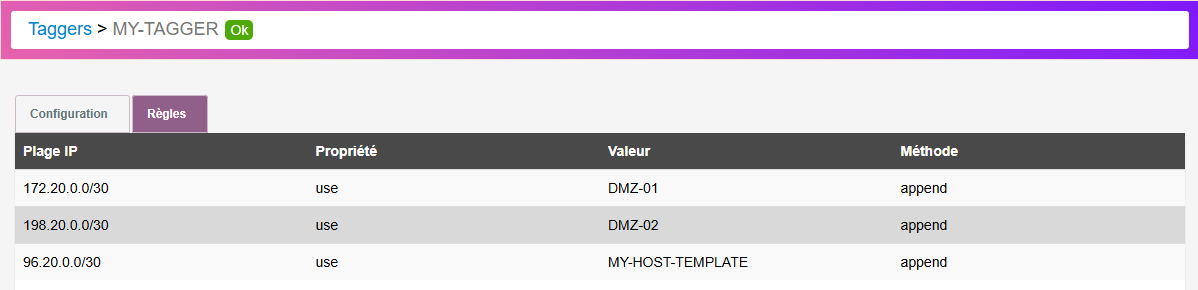 Les règles apportées par chaque module apparaissent à l'intérieur du Tagger, dans l'onglet Règles :